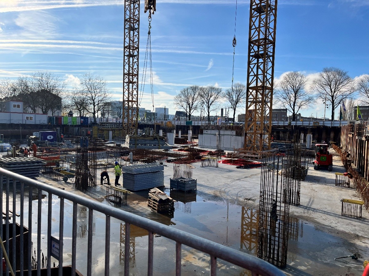 - Recent afgerond (begin december): het stempelraam is succesvol uit de bouwput verwijderd. De bouwput is nu klaar tot en met de -1 van de keldervloer. Nu het stempelraam is weggehaald, kunnen we het betonwerk van de -1 keldervloer richting de begane grond maken.