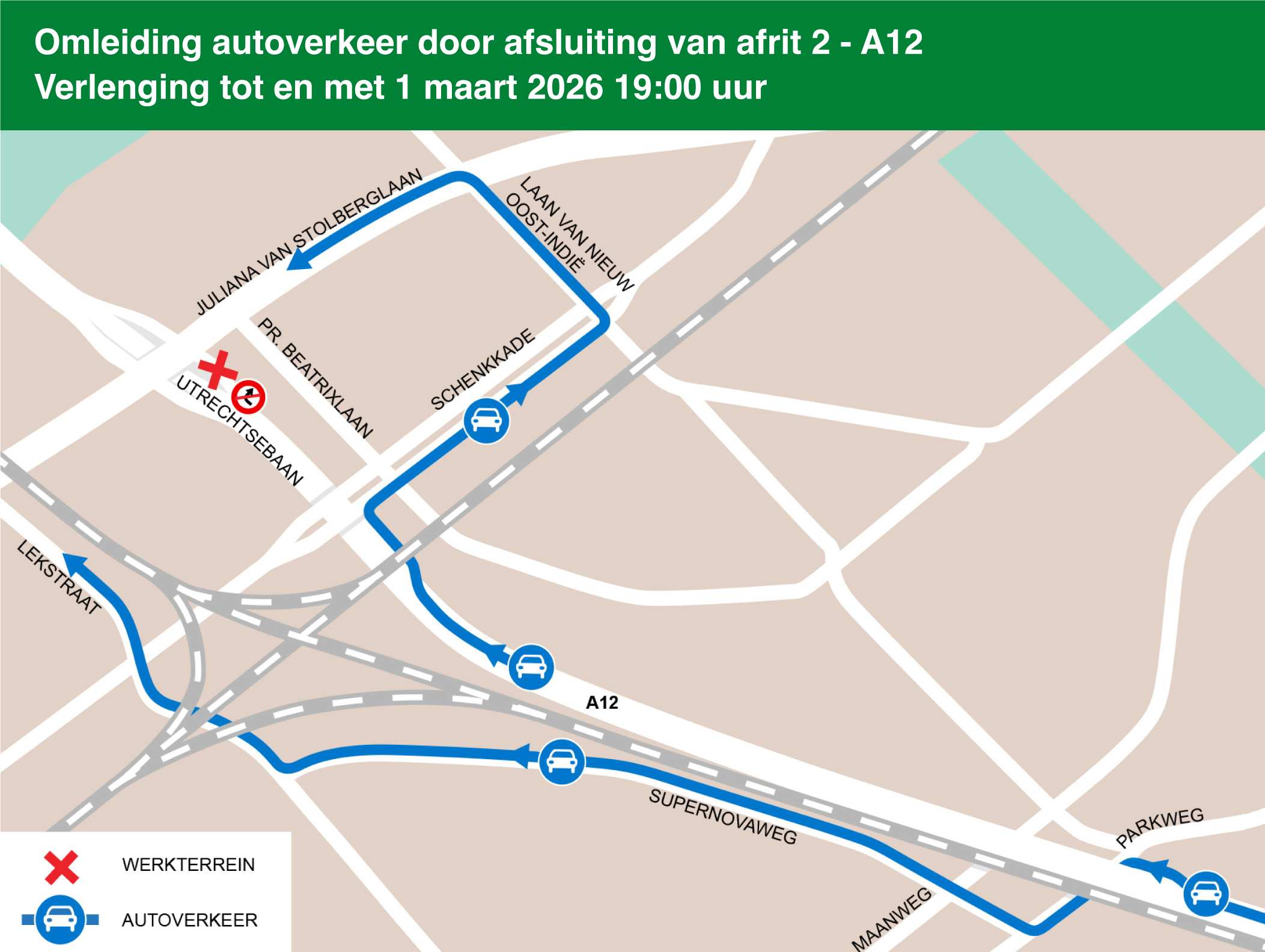 De gehele afrit 2 van de A12 blijft afgesloten tot zondag 1 maart 2026 19.00 uur. De Juliana van Stolberglaan is en blijft bereikbaar tijdens deze periode. Wel zijn er op de Juliana van Stolberglaan korte verkeerstops tussen 09.00 en 15.00 uur. Zie onderstaande kaart voor de omleidingsroute.